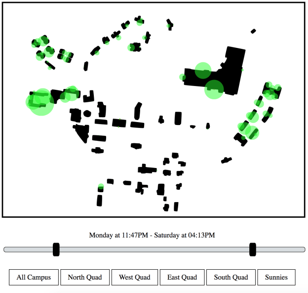 However, thanks to a new set of data, which captures a week of swipe transactions from last spring, we are able to ask questions such as what time does this migration begin? When do people return? And where are they denied entry? We do not have names and are not interested in tracking individuals, merely the aggregate movements of the student body across a week.