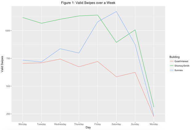 It isn’t until Saturday that we see a spike in Sunnies’ activity that seems linked to activity in Freshmen dorms, with regular housing dropping from around 1000 valid swipes to a little over 800; a somewhat proportional drop is also seen in quiet/special housing. It would appear that the common notion that Freshmen flood the Sunnies on any given party night appears to be a campus legend with only one night a week linked to the decrease of valid swipes into Freshmen housing.