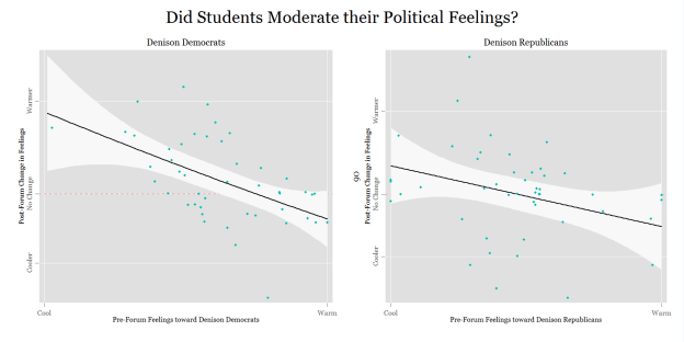 But after the forum, participants changed their views a lot – the average was a 15 point swing for both groups. The figure below shows the direction of that change given where they started in October. The left panel shows views toward Denison Democrats, the right panel toward Denison Republicans. If they polarized, then the graph would show a line from lower left (cold gets colder) to the upper right (warm get warmer). Obviously, the evidence points in the other direction – the cold get warmer, and the warm get colder after participating in the forum. The evidence is a bit messier in the case of feelings toward Republicans (and hence is statistically marginal evidence), but the general pattern is the same.