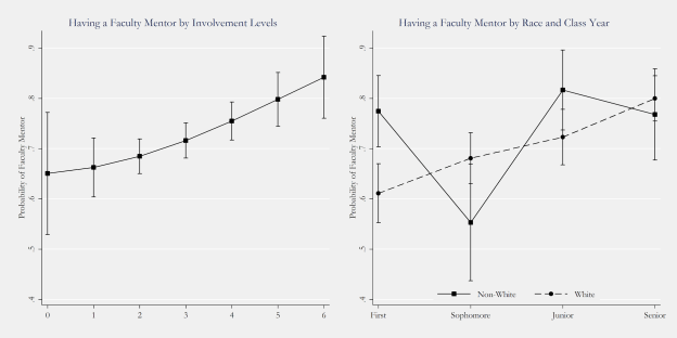 I wanted to see how mentorship levels vary across class years, for white and non-white students, and by campus involvement. Those results are shown below. Mentorship goes up with involvement, but for most students (who are in 1-3 groups), it really doesn’t make much difference. The other panel shows how mentorship with a faculty member climbs across class year. It does that in a steady fashion for white students, climbing from 60 to 80 percent by senior year. For non-white students, mentorship is sky high in the first year, then drops off a cliff in the sophomore year before climbing back to the same level as first year. Now the number of students in these classes is relatively small (e.g., 24 non-white sophomores in the sample), but we do get a hint that something is different and missing in the famously anomic sophomore year.
