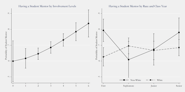 It’s interesting that having a student mentor really doesn’t change across class years, at least for self-identified white students – it hovers in the upper 60s. For non-white students, it looks like the faculty mentor pattern – it is very high in the first year, drops off by 20 percent, and then steadily climbs back up by senior year. That disruption looks worrisome, though we have yet to see if it is linked to any problems.