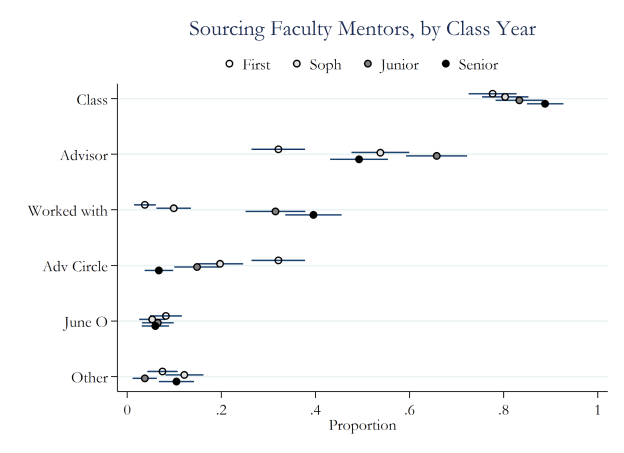 The results of our recent survey confirm as much – just under 80 percent of first years indicate having taken a class with a mentoring professor, a figure which climbs to 90 percent by senior year. Mentors are not necessarily assigned, though the first year matching process doesn’t do a bad job (just over a third of first years name their advisor as a mentor), but add some selection processes and time and the figure climbs to over half. First years don’t do much work with faculty, but by junior and senior year, considerable mentoring happens in the context of common work with a professor.