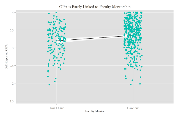 From a social scientist’s perspective, the trick of Adam’s assertion of the importance of mentorship is that mentors are not randomly assigned. That is, students may have to be in the right place and with the right frame of mind to help give a mentoring relationship a chance. Those simple notions suggest that mentoring may have little to do with promoting success in college and life and may instead just reflect it. Having a mentor may simply be a byproduct of what students who are doomed to be successful do – they may pick up a mentor along the way to greatness. Moreover, reporting mentoring relationships could just be a function of having more social support, more friends. Having more friends is bound to increase the probability of talking about important problems and gaining advice.