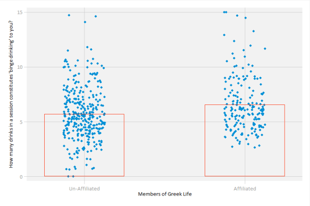 To answer this question, I draw on data from a survey conducted at the beginning of the 2018 Spring semester. Among the questions were a series of binge drinking inquiries. The focal point of this piece is: “How many drinks in a session constitutes “binge drinking” to you?”[1] This question was asked to give us insight on students’ tolerance: to help us find which students truly wield the iron stomach. Spoiler alert: they are definitely affiliated with Greek life.