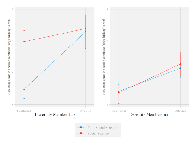 Perhaps as result of the link with Greek life, majors in the social sciences have a higher tolerance than those with other majors. Interesting enough, unaffiliated males who are social science majors define binge drinking significantly more than those who are non-social science majors. This difference is not seen among affiliated males — and being both affiliated and a social science major makes little to no difference to binge drinking definitions. This proposes a new question: why do male, social science majors define binge drinking at a higher rate? The difference is greater than affiliation with Greek life.