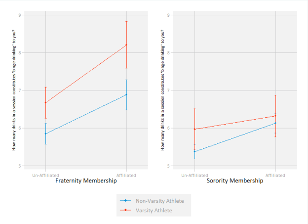 Now for the big ones — varsity athletics and Greek affiliation. First off, unaffiliated males who play varsity sports define binge drinking less than social science majors, further intriguing me. For members of a fraternity however, involvement in a varsity sport has a large influence on their alcohol tolerance; much more so than among members of a sorority. Being in a varsity sport has little to no effect on how sorority girls define binge drinking, the difference is actually much larger among unaffiliated Sorority girls.
