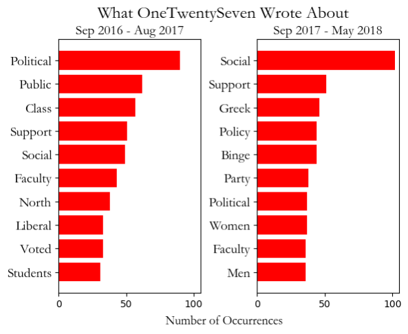 In our first year (2016-17), we got on our feet by writing mostly about politics (in fact, we used the word ‘political’ 90 times, an average of 2.4 times per article). Topics such as voting and ideologies surfaced time and time again. This past year, we still covered politics, yet we also expanded and diversified our coverage to discuss a much broader range of campus topics.