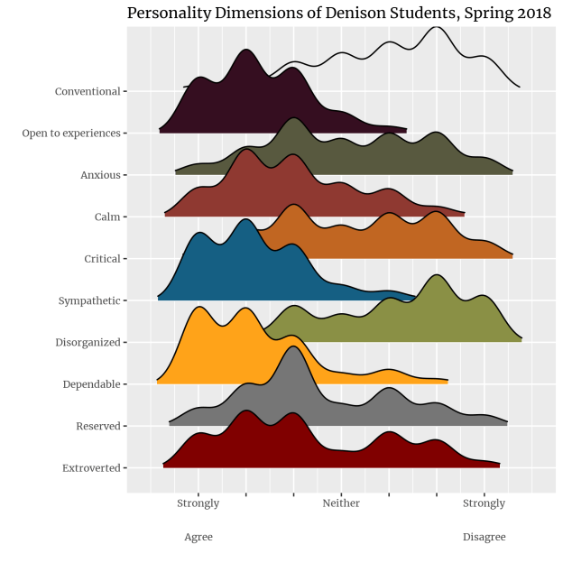 We talk a lot about “The Denison Student.” She is engaged with the world, actively involved in her community, curious to investigate a wide variety of questions, willing to take some risks, etc. I’d like to think about this in a related, but more systematic way – what personality profile do Denison students present?