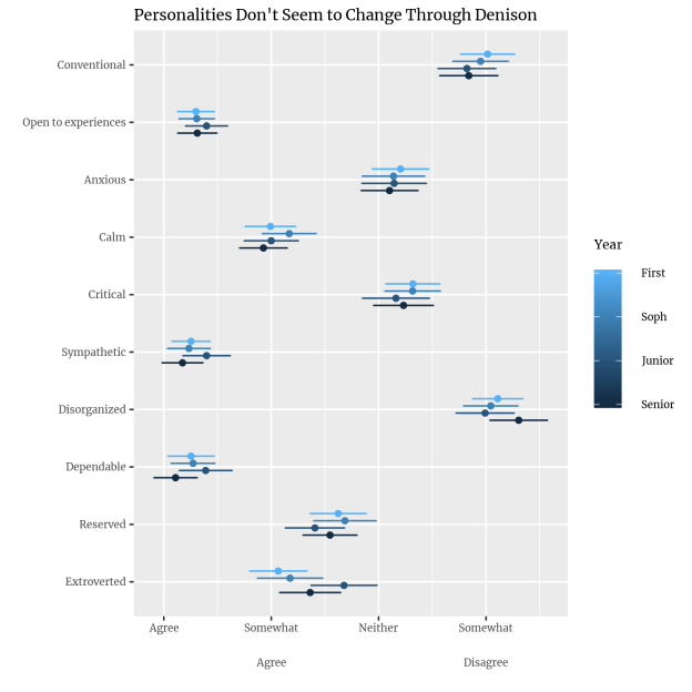 The stereotypes show through here. Denison students, in their self-assessments, are not conventional or disorganized, but are dependable, empathetic, and open to try new things. Given that these traits do not differ across class years, we would call this a “selection effect” – Denison attracts this sort of student and doesn’t appear to mold them in these ways.