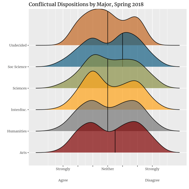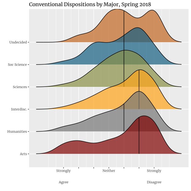 What about conventionality? I think we have pretty strong priors about who would label themselves as creative and reject convention. Are there major divisions that would call themselves conventional, though? Well, as the figure below shows, no – no major divisional is willing to call themselves conventional, but some reject it harder than others – our Artists and Interdisciplinary majors.