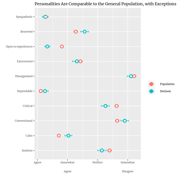 Last question: Are Denison personality profiles any different from the general population (genpop) in the US? I happened to have survey data from a nationally representative sample from 2016 that uses these exact same questions. The results (below) are revealing in that Denison students are different from the genpop, but not tremendously so. Students are more open to experiences, less reserved, more critical, less conventional, less calm, and more anxious. That sounds right, but note how small these differences are.