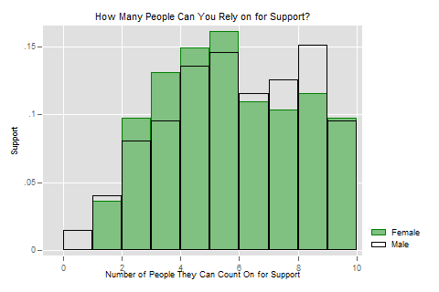 Now that we have established that, we can move onto the differences by gender. In this figure we can see that there is a difference in the support systems of men and women on campus. The green represents the women on campus and the outlined area represents the men. This shows that there is a larger concentration of women who can depend on 3 to 6 people for support but also a larger concentration of men who can depend on 6 to 9 people for support. But, overall, the difference in the means is very small – men’s self-reported support networks are insignificantly larger (.2 out of 10 – 5.8 vs. 5.6).