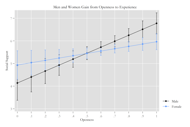 There is clearly a lot of variation among men and women, and this is where I think personality may come into play. As noted, men and women are different when it comes to many things including personality. Arguably the most relevant to support systems, or good friends as I see it, is how open to new experiences and how quarrelsome you are. In terms of openness, men and women aren’t really different and as you can see this reflects in the amount of support they see. The figure below shows that open people can rely on significantly more people for support regardless of whether they are male or female (but it makes a bit more of a difference for men).