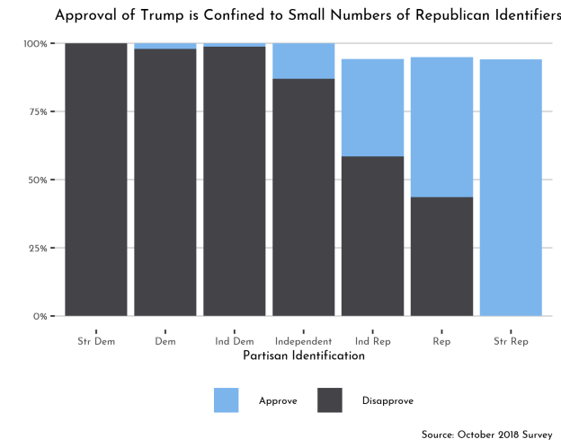 One way we can tell if views are concentrating among Republicans is through comparison with February 2018 data. Shown below, it’s plain to see that his approval was more concentrated among Republicans and did not hold a majority of any group except strong Republicans. He was clearly making inroads among a wider Republican group in election season.