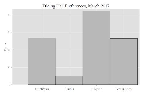 Alright everyone, let’s settle this debate. Which is better: Huffman or Curtis? The March 2017 survey asked the question: “Where is the best place to eat on campus?” and included options for Curtis, Huffman, Slayter, and “My Room.” Due to new regulations, Slayter is not on the menu for 2018. The result show that a majority of people felt Huffman was the better option between the two dining halls, but nearly ties with the “My Room” option, both with around 45 percent of responses. Curtis falls far behind both of these options with only about 8 percent of responses favoring Curtis over Huffman. This survey went out right before the Curtis renovation so it makes sense that it would be the loser for 2017 but what about now? Post makeover, how does Curtis stack up in 2018?
