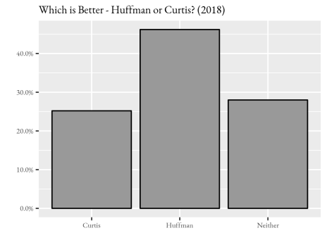 While Curtis did make a comeback in 2018, it still trails far behind Huffman. In the fall 2018 survey, we asked again about dining preferences but this time included options for Huffman, Curtis, and Neither. The neither option serves as an option for students, namely seniors, who do not have a meal plan and primarily eat off campus (actually juniors average slightly more off-campus eating, but both around 2.5 days a week). In this year’s results, we can see that Curtis has now jumped to 25 percent of the responses while Huff remains at about 46 percent of responses; ‘neither’ beats Curtis with 28 percent. This increase is probably due to the renovations on Curtis, which undoubtedly improved the quality of dining. Even with renovations, students still prefer Huffman.
