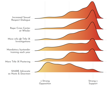 An explanation for this trend is that policies addressing sexual misconduct are often either interpreted as punitive or preventative. A policy which counters sexual misconduct through the presence of SHARE advocates when handed down by administration might feel like a punishment and an infringement on students’ social lives. Alternatively, the same policy backed by students is more likely to be interpreted as an uplifting, preventative measure, reflecting a cultural shift on campus. It makes sense, then, that students would favor somewhat more the uplifting signal of progress over an administration-imposed regulation.