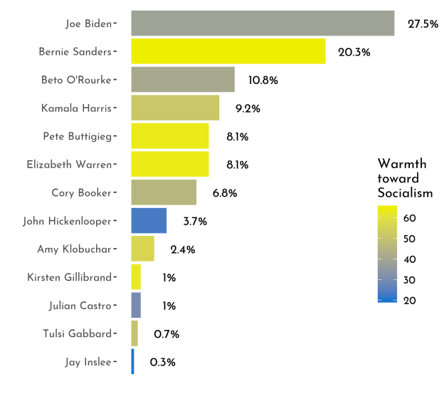 We shaded the bars by the average warmth toward socialism to see if ideology is influential in picking a candidate. The candidates are not enormously different from each other, but do differ, for instance, in whether they support Medicare for All (moving to government as the single-payer for health insurance). No surprise that Bernie supporters feel warmer toward socialism, and Biden partisans are less warm. Supporters of O’Rourke and Harris, somewhat more moderate candidates, are cooler toward socialism, while Elizabeth Warren and Mayor Pete fans are warmer. Must say, it’s refreshing to see that ideas matter.