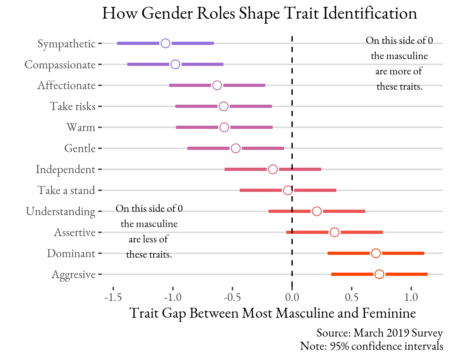 Denison students are not deeply divided by gender in how they represent themselves, but perhaps it is their gender roles that more closely align with traits. That evidence is shown below. The dots represent the difference between the most masculine versus the most feminine identifiers. On the left side of 0 means that masculine identifiers are less of that trait, while on the right side of 0 means that masculine identifiers are more of that trait compared to feminine identifiers (a gap the size of +/- 1 point means about a 15% difference in the trait scale).