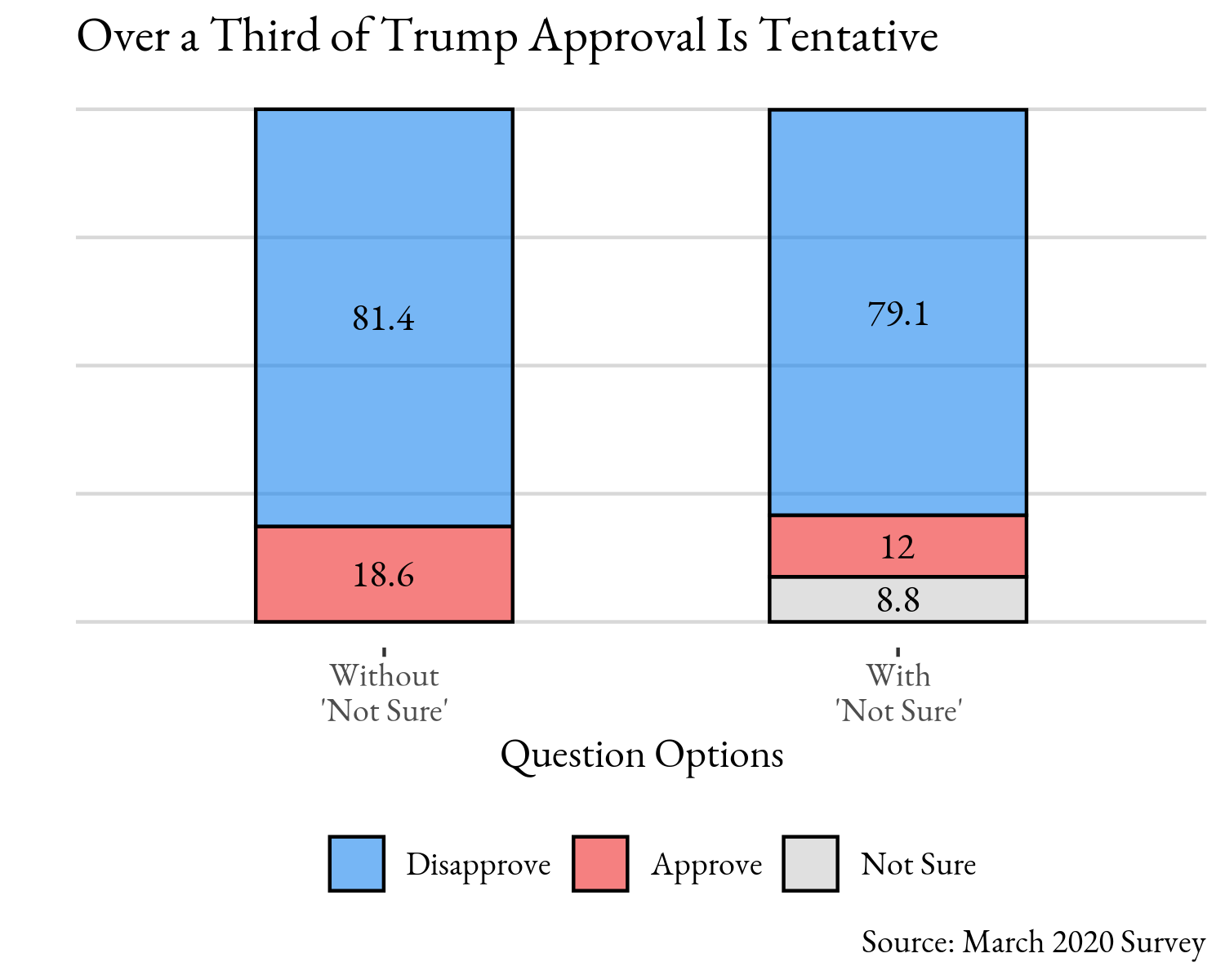 When American politics is so deeply polarized, even on campus, we naturally presume that partisan attitudes are rock solid, immovable, immune to facts. We didn’t experiment with facts, but we did experiment with the inclusion of a “not sure” response option in the approval question. Half of the sample was assigned to each and as the following figure shows, disapproval did not change (much) across the two versions, but approval did. Trump’s approval dropped almost 7 points, suggesting that a good chunk of his support is tentative or soft. That’s interesting because the social norm on campus would probably be to disapprove. Perhaps Republicans have their own group norm that some are tentative about, when able to express it.