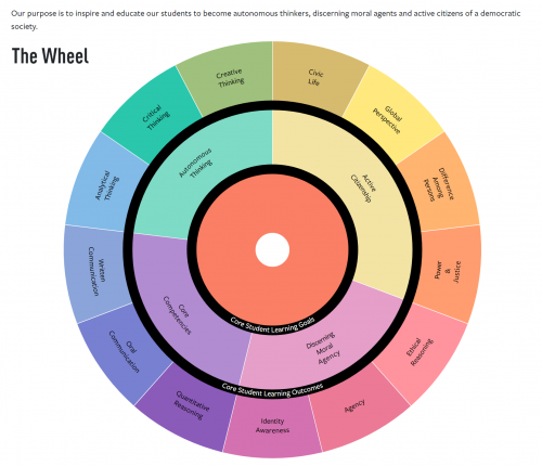 Perhaps you stand with Zach Correia, who opined in The Bullsheet that, “Nothing captures the essence of a free-thinking aspect of the liberal arts like pre-defined outcomes!” But at a very basic level, it is tremendously difficult to understand the world without conceptual bins. You will have a more or less wide range of experiences in and out of class that will result in a transcript and perhaps a resume, but how do you make sense of those long lists? What does it all add up to? Seen in this light, The Wheel is a codex that can help translate your lists of specific experiences into a holistic narrative that can be interpreted by a general audience. Moreover, showing that you can engage in this meta-level of thinking is perhaps just as, if not more, important as the experiences themselves.