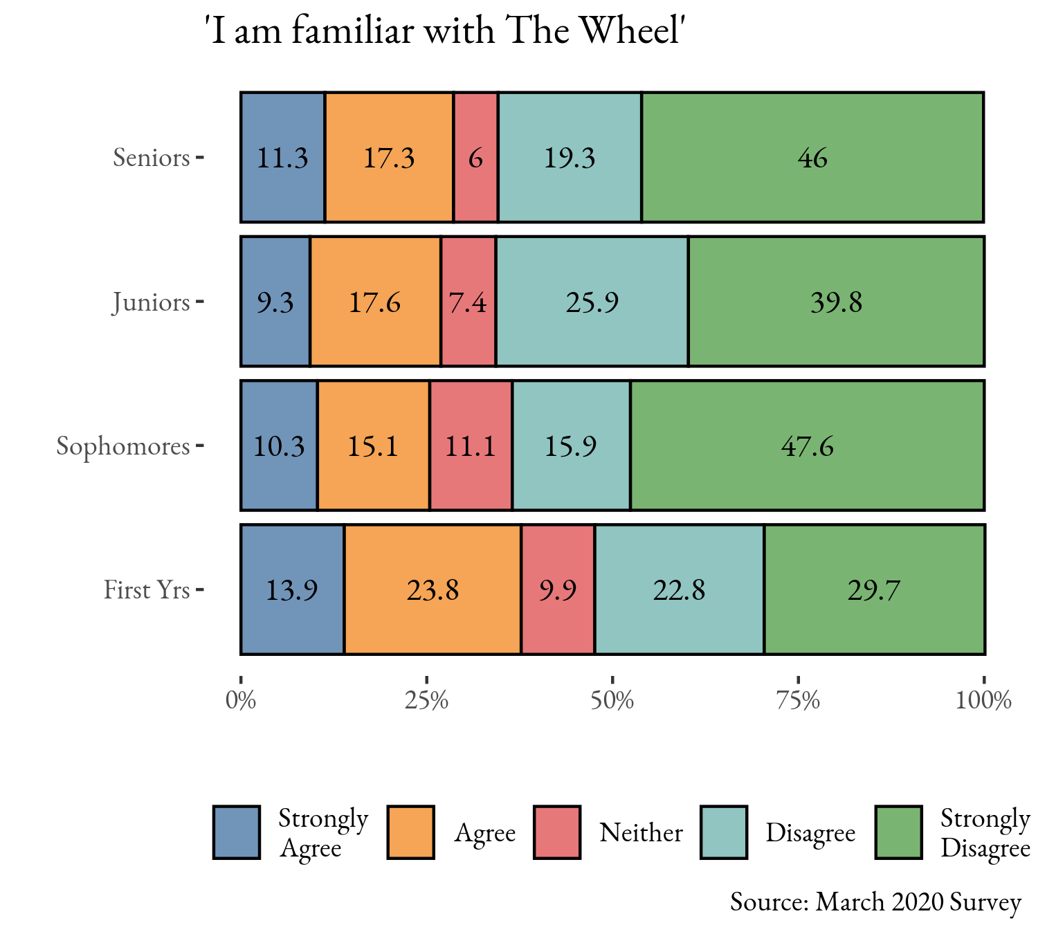The Wheel is rather new, so perhaps it’s no surprise that it’s not well known or used. Is it more commonly known among first years? Yeah, a little. A slim majority of first year students disagree that they’re familiar with the wheel, but that’s less than the ⅔ of juniors and seniors who are unfamiliar with it. The same pattern repeats for the other questions – just under 20% of first years say they are using The Wheel compared to a veritable handful of seniors. Somewhat more first years, too, see value in The Wheel, though that view is not common among any class year.