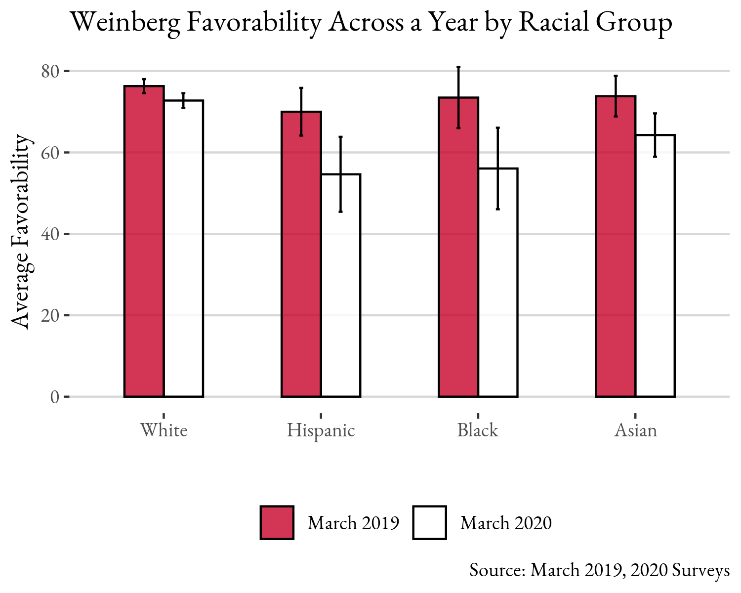 Was this near 20 point gap in approval between these groups always there or is it new? I dug out the data from a year earlier to check and the results are shown below. In March 2019, prior to the declaration of phasing out the University’s relationship with the Posse Foundation, students of color had much higher favorable feelings toward President Weinberg. For example, students who identified as black had an average favorable rating of 71. Therefore, it seems likely that President Weinberg’s Posse Foundation announcement directly contributed to a decrease in favorable views.