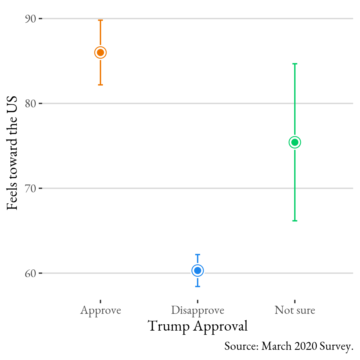 Overall, Denison students gave a favorability rating of about 65 towards the United States. As seen in the figure below, it is clear that the students who indicated that they approved of the way President Trump was handling his job had a much higher level of favorability towards the United States, at about 86. And unsurprisingly, students who disapproved of Trump also had a much lower favorability towards the United States, at just above 60.