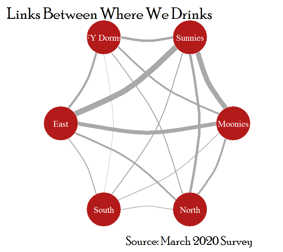 Figure 3 paints a really interesting picture of where Denisonians drink on campus. One can also interpret locations for drinking as locations for partying and socializing, as those terms tend to be synonymous. The network below links the 6 locations offered to respondents when they answered the question mentioned earlier. Thicker lines mean that more people said they drink in both locations: Sunnies-East is the most popular combination (32%), with Sunnies-Moonies a close second (28%), and South Quad-First Year Dorms is the least common (3%). Put another way, as of Fall 2019, the Holy Trinity of Denisonians’ places to consume alcohol was the “notorious suites of East” Quad, Sunnies, and Moonies.