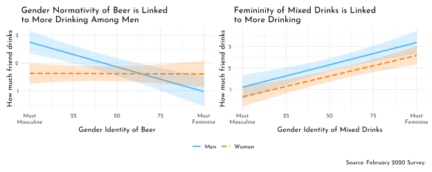 We can also link these notions to drinking, which the following figure shows. Here the results differ quite a bit by the type of drink consumed. Seeing beer as more masculine is linked to more consumption by men but not women. But both men and women consume more when they see mixed drinks as more feminine.