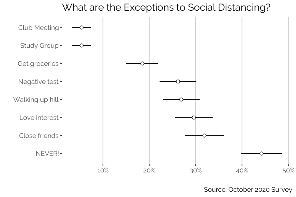 We sought to quantify that by asking about the exceptions – what circumstances would permit breaking the community care agreement to maintain social distance? The results just in from our October 2020 survey of nearly 600 student respondents (thank you!) suggest the reasons are plentiful and diverse. Only 44 percent say that nothing justifies social interaction, so most believe that at least one exception is valid (the average is 1.4). As the figure below shows, very few (~6%) indicated that a club or study group justified meeting face to face, while nearly a third indicated a love interest or close friends validated social interaction, and 18 percent indicated that they could break social distancing guidelines in order to get groceries.