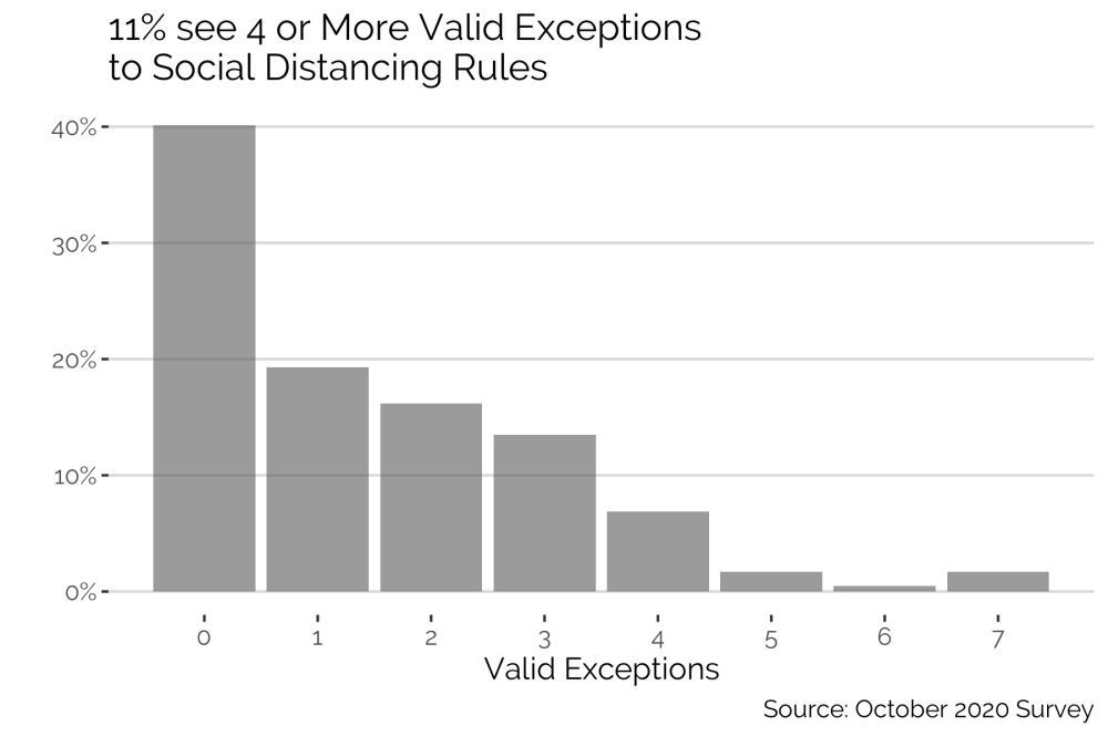 While a plurality see zero exceptions (see below), a majority does not and a small minority (~11%) see all sorts of exceptions (4+). A few percent even see all of the listed circumstances as valid exceptions to social distancing rules. Most students only see a few cases as exceptional and if they know the person has had a recent negative test, is that unreasonable?