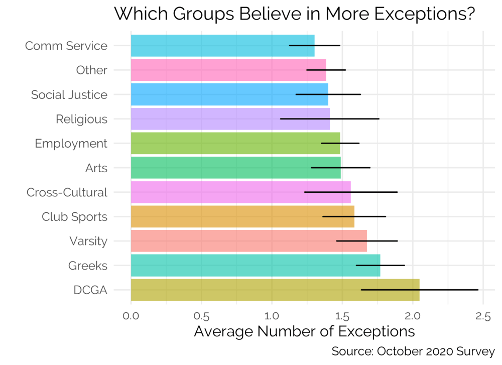 “Exceptional thinking” can’t be evenly distributed across campus, can it? Surprisingly, it almost is. The figure below shows some differences across groups, but they are not large. In a survey “odd couple” moment, those involved in campus governance (which I labeled DCGA for convenience) and Greeks believe in the most exceptions (2 and 1.75, respectively). Everyone else is indistinguishable. We can layer on top of this that men are more likely to engage in exceptional thinking, adding about a quarter more exceptions to the tally. Perhaps exceptional thinking is more about individual psychology than group attributes.