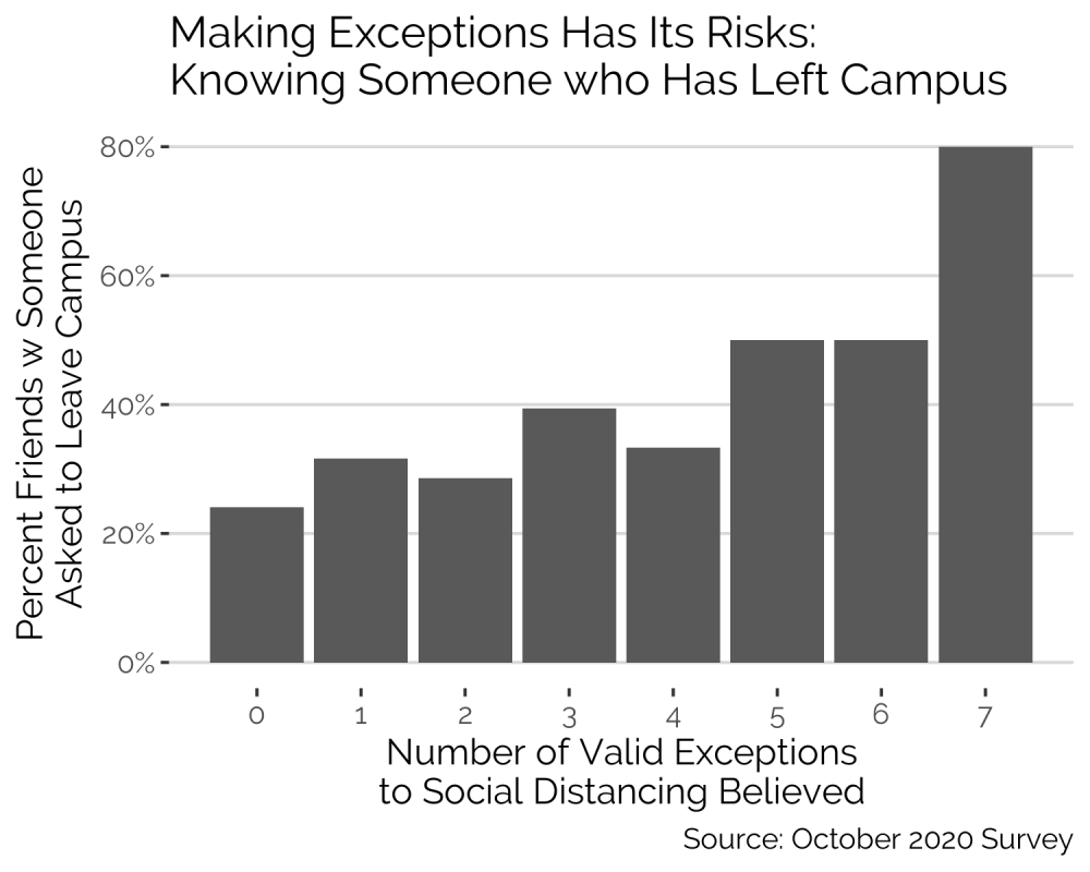 There’s one major “but” to that conclusion, however: exceptional thinking appears to cluster among friends. This isn’t that hard to fathom since it takes more than one person to violate social distancing rules. How can we tell? Well, we asked whether the participant knew someone personally who was asked to leave campus for violating the care agreement. As the figure below shows, the rate of knowing someone asked to leave climbs drastically the more exceptional thinking they engage in. There aren’t many who see every scenario as justifying an exception, but among them 80% know someone personally who was asked to leave. The rate is just over 20% for those who see zero valid exceptions.