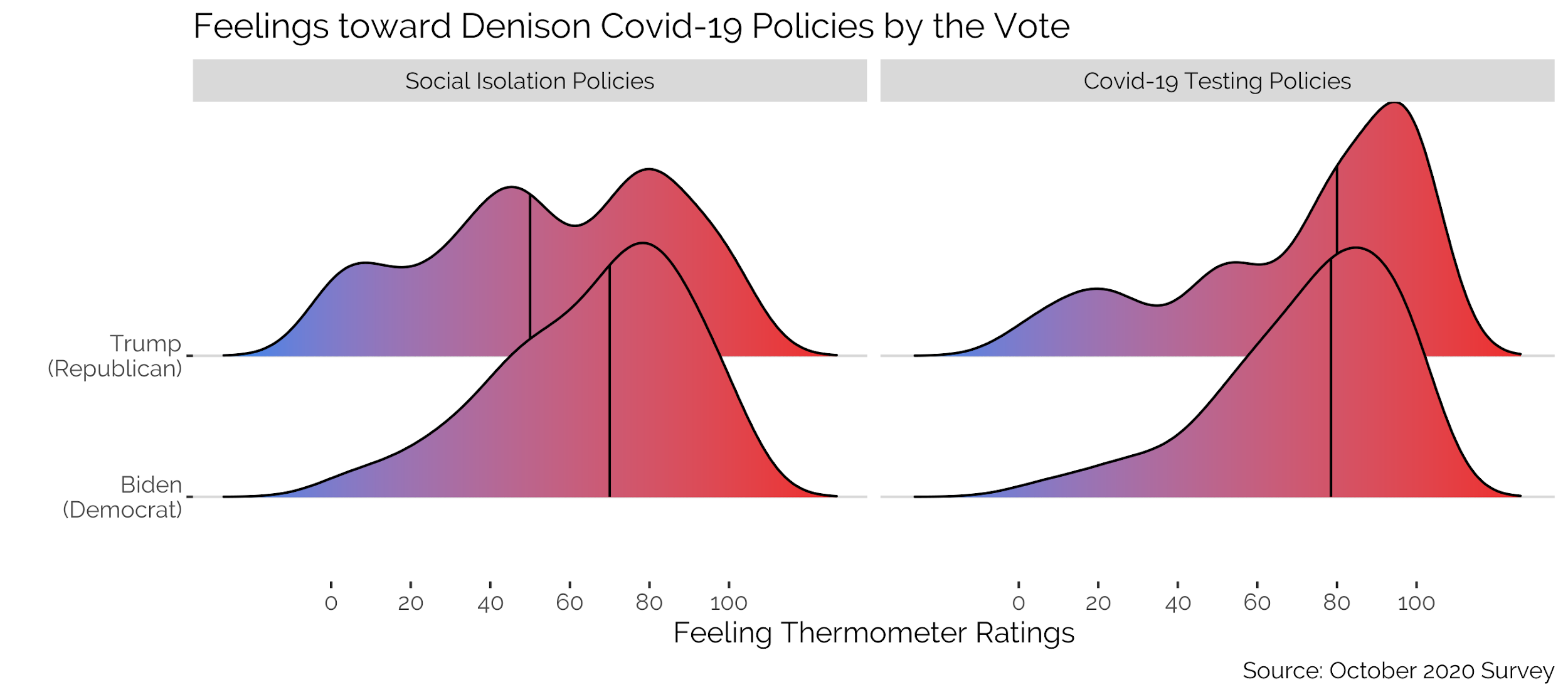 Campus is overwhelmingly in support of Joe Biden’s candidacy, which may explain the high regard for Denison’s restrictive public safety measures. There’s some support for that notion. Trump supporters view Denison’s social isolation policy less favorably on average, with a median score of 50 for social isolation policies compared to 70 for Biden supporters. Trump supporters were also more divided in feelings toward Dension policy. Biden and Trump supporters tend to hold similar favorably to Denison’s testing approach on average, but again Trump supporters appear more divided in comparison to the concentrated peak in favor of testing from Biden supporters.