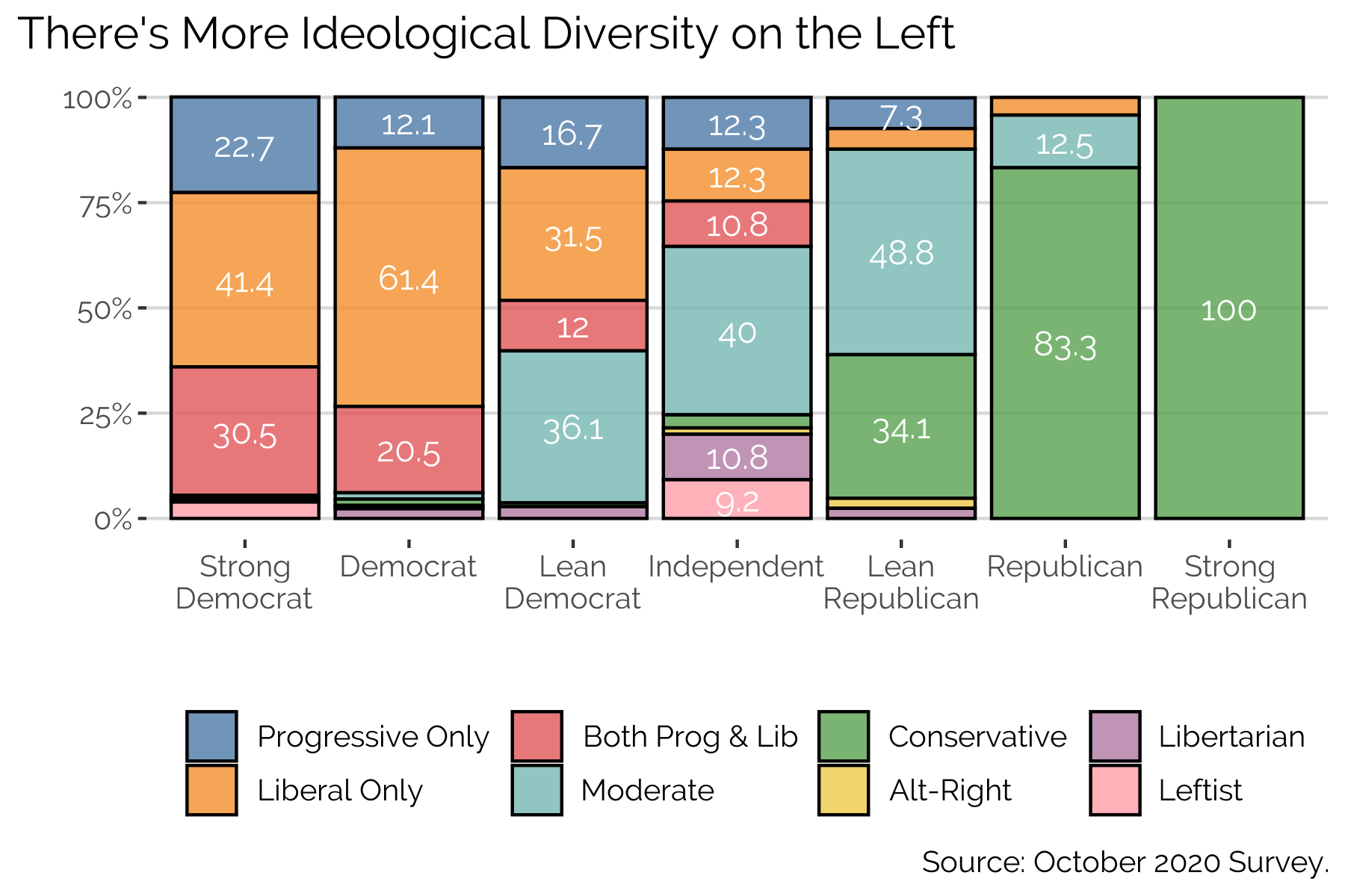 But are all those Democrats all on the same ideological page? Let’s take a look. The results below show more ideological differentiation among Democrats than Republicans. Whereas Democrats are split among progressives and liberals, Republicans are almost unanimously just conservatives. Given the results above, it’s important to note that there are relatively few pure progressives and that they appear across a wide selection of the partisan spectrum. There are a few progressive Republicans and independents (which also includes the “other” category), though most identify as some form of Democrat. And those who call themselves “Left” are mostly not identifying as Democrats, which is no surprise given AOC’s reaction on Twitter.