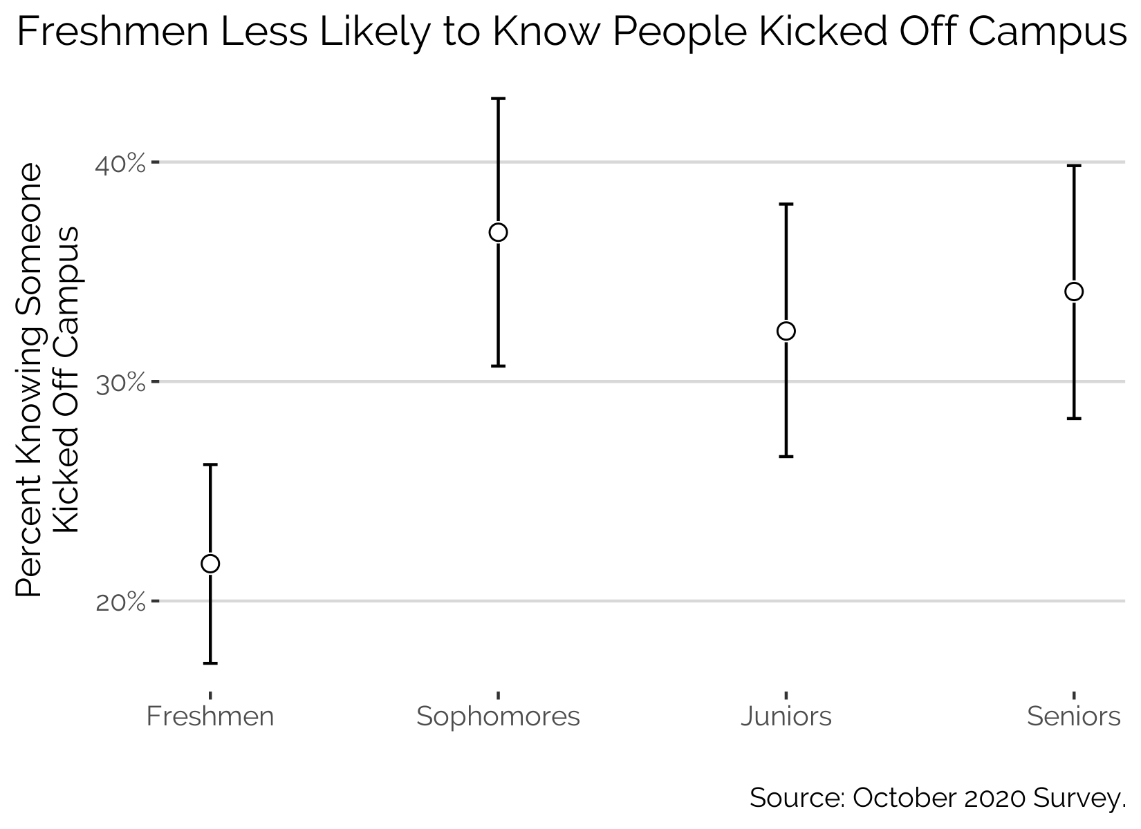These questions make us think about the relationship between people getting sent home and their friends’ reactive view of Campo. The data from 127’s survey shows that the freshmen are the least likely to know someone that has been asked to leave campus for violating the Community Care Agreement. Therefore, perhaps the freshmen have the most positive view of Campo because fewer of their friends were sent home this semester.