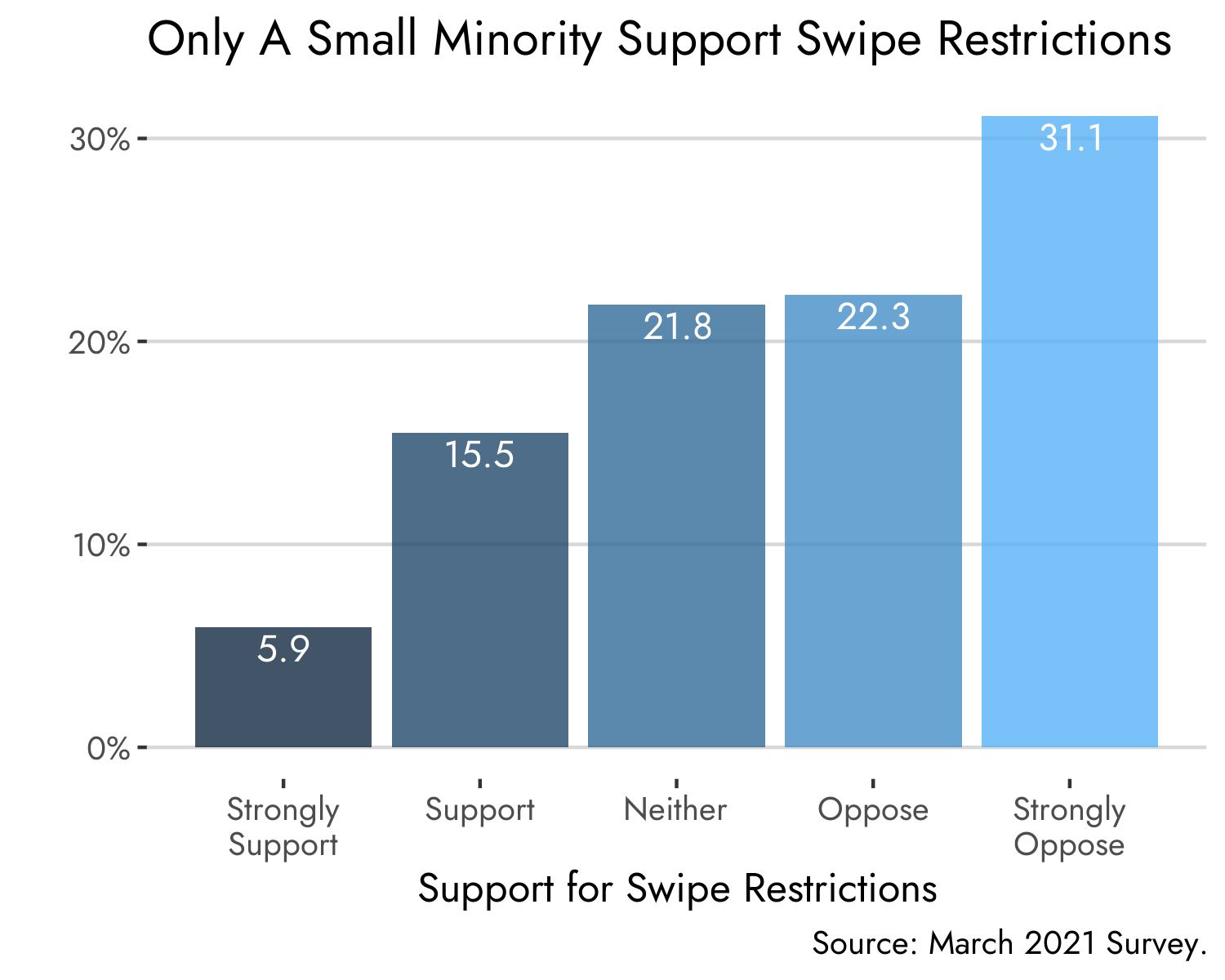 However, there are some differences by class year – freshmen are the most supportive (though only 30 percent) and sophomores are the least (at 13%). Seniors lag first years by 6 percent. Why? I suspect that some seniors like the exclusivity of their living arrangements. There’s actually some support for that from a different direction. We asked about support for “special housing options that enable students to live in dorms centered around a community experience.” It turns out that support for special housing is linked to support for swipe restrictions – both indicating greater levels of exclusion (or at least niching). And the level of support among freshmen is interesting given the framing of our question, which suggested that restricted swipe access may be the most problematic for new students.