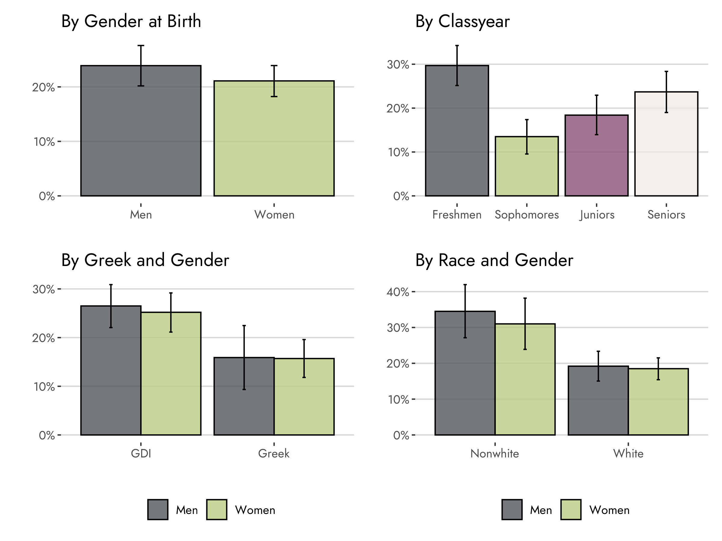 Note: The data represent much of the diversity of campus, though there are some gaps between the respondents and what Denison reports as the student body composition. The sample is 12% first-gen, but the campus is 15%. Campus is 51% women, but the sample is 60%. Campus has typically been about 30% Greek-affiliated, but the sample is 35% (Denison does not report that stat on Fast Facts).