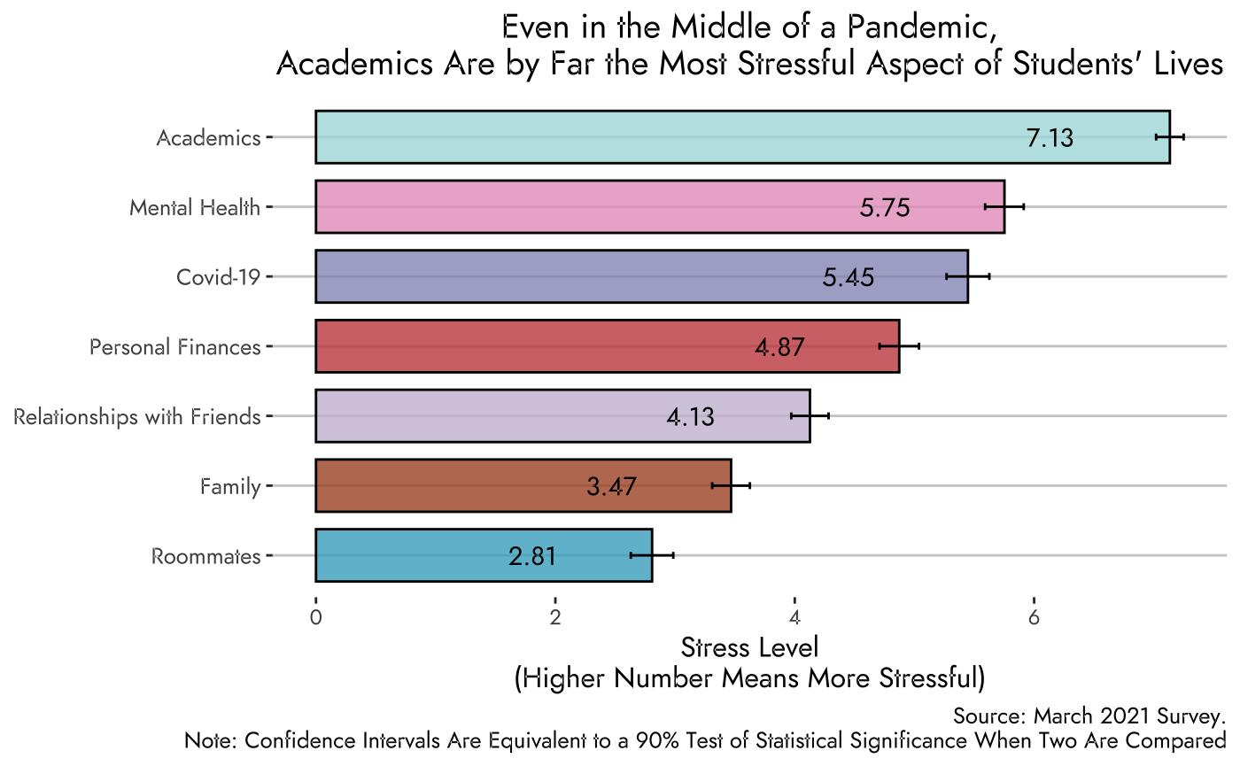 Nationally, academics were reported to be the biggest stressor in student life, so we wanted to see if Denison followed the trend or if other factors contribute to stress on the Hill in more significant ways. Sure enough, academics took the lead as students reported academics being the most stressful aspect of campus life. Mental health followed in second with COVID-19 coming in a close third, leaving some hope for the future when (if?) COVID-19 and its stressors will eventually subside.