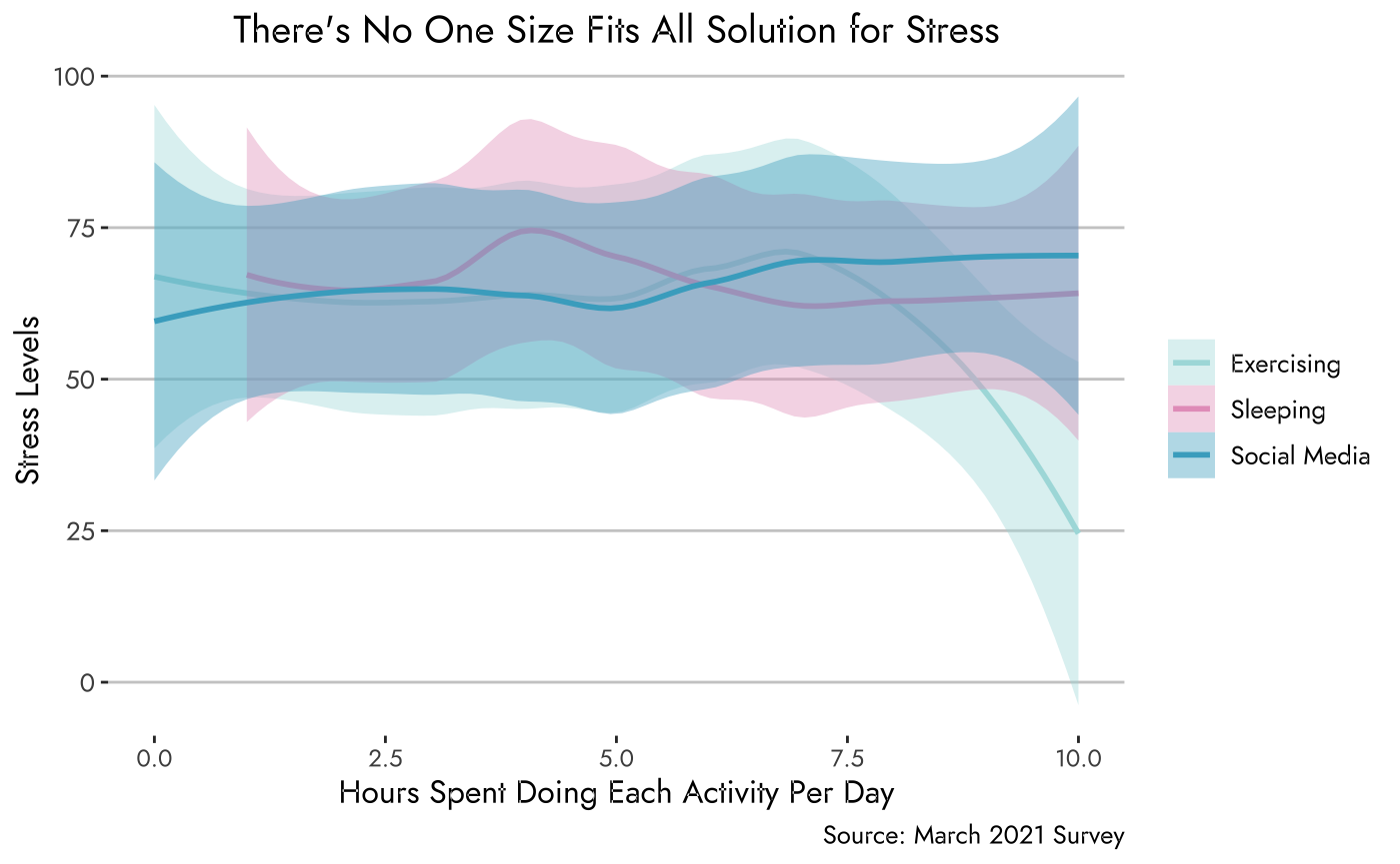 Since we’ve established that stress is all over campus, how does one “be less stressed”? Sadly, campus hasn’t found a cure-all for students’ stress as stress levels remain steady despite the amount of time spent exercising, social media surfing, or sleeping. Although exercise and sleep didn’t seem to alter stress levels, engagement in meditation practices in one study correlated with a significant reduction in reported stress. (Note to self: to try out mediation when I have some free time)
