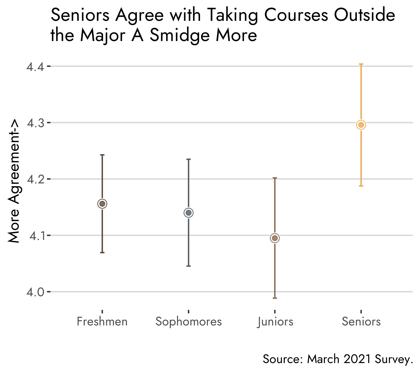 But Denison is also a liberal arts college and understanding just what that entails is something that may deepen over time. Indeed, this is the season when seniors and alums reach out to old professors in and out of their major to say thanks, they never knew that they would enjoy art history, statistics, geology, whatever. Can we find evidence that appreciation of the liberal arts grows with time? Not really, not with this blunt measure anyway. Seniors DO appear to have a higher level of support for taking courses outside their major, but not by very much.