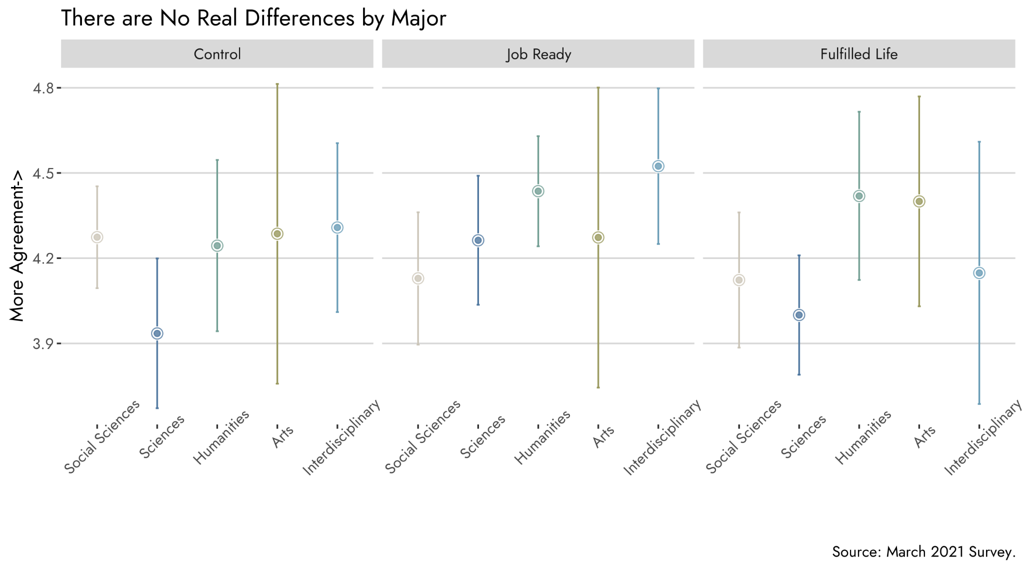In the figure below, I break out support by division of majors and there really is no difference among them (or in response to the job and fulfilled life treatments). Perhaps science majors are on the lower end, but the differences are so small that they are nowhere near statistically significant.