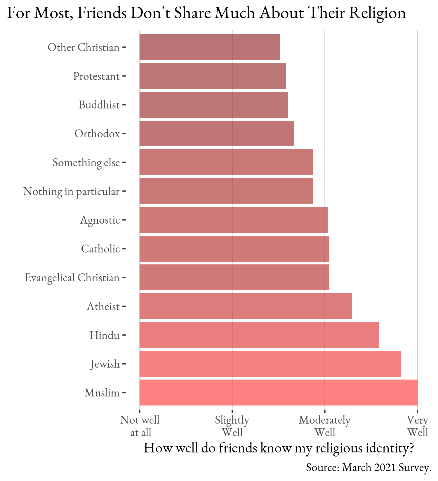 The other notable exception is evangelicals who are the near equals of Muslims in religious importance, but for whom friends know their religious identity poorly. This cuts against the identity label – evangelical means to “share the good news” about Jesus Christ. But evangelicalism has taken a pretty serious hit to their reputation by dint of their ardent support for Donald Trump, especially among those outside the Republican Party. I suspect that evangelicals on campus are not particularly loud about their faith in this liberal bastion.