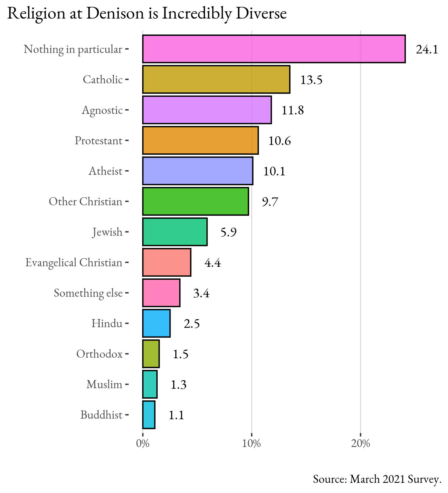 Beyond that, religion at Denison is incredibly diverse. Almost every major religious tradition in the world is represented save Sikhs, at least among survey respondents. There is truly a rich pluralism of religious identity among the student body.