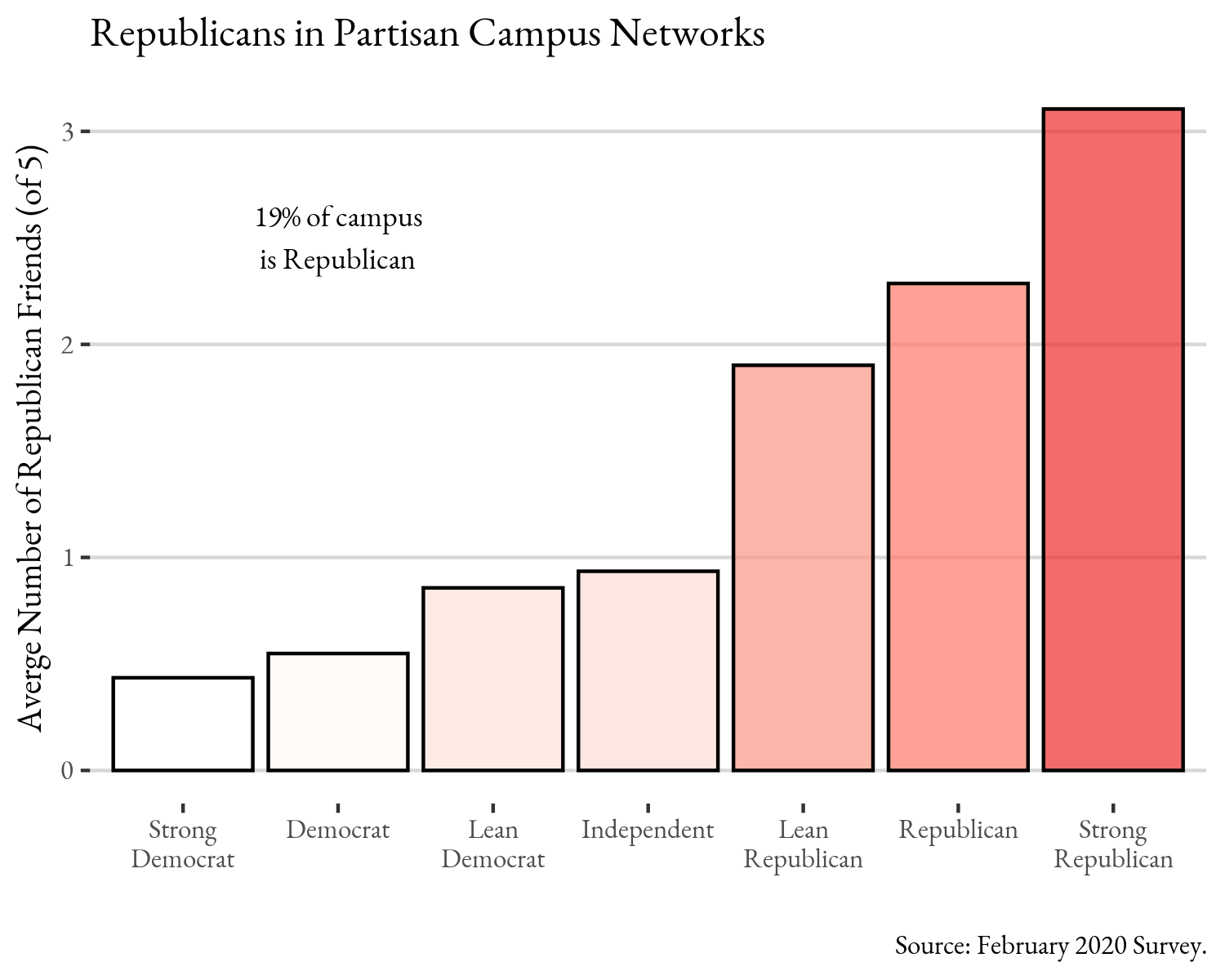 We are drawing on data from February of 2020 from around 500 student participants, in which 19% identified as Republican. Though there are other measures of it, this does not show a lot of political diversity at Denison. The survey also posed the question, “Out of the 5 people you are closest to on campus, how many are Republicans?” Paired with the demographics of survey participants this study led to interesting findings regarding bipartisan friendship at Denison.
