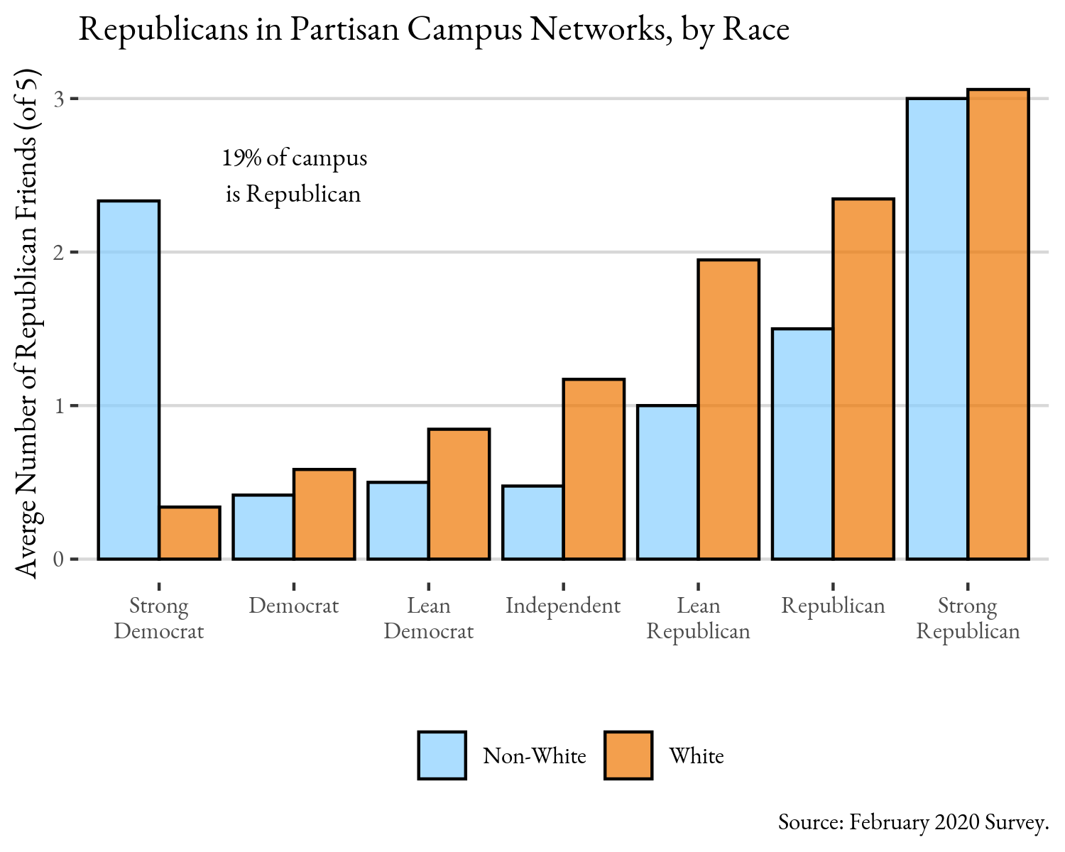 I was curious if partisan bias was reinforced by any of the demographic and organizational divisions on campus. Or if US politics, which has been deeply divided by and over race for a long time, shows any replicated divisions on campus. In the figure below, there is almost a persistent gap where white students have more Republican friends. That is especially true toward the middle of the partisan scale and among weaker Republicans. There is no gap among those who identify as strong Republicans, for whom ⅗ of their closest friends are Republican, and somehow the few non-white strong Democrats report a lot (⅖) of Republican friends.