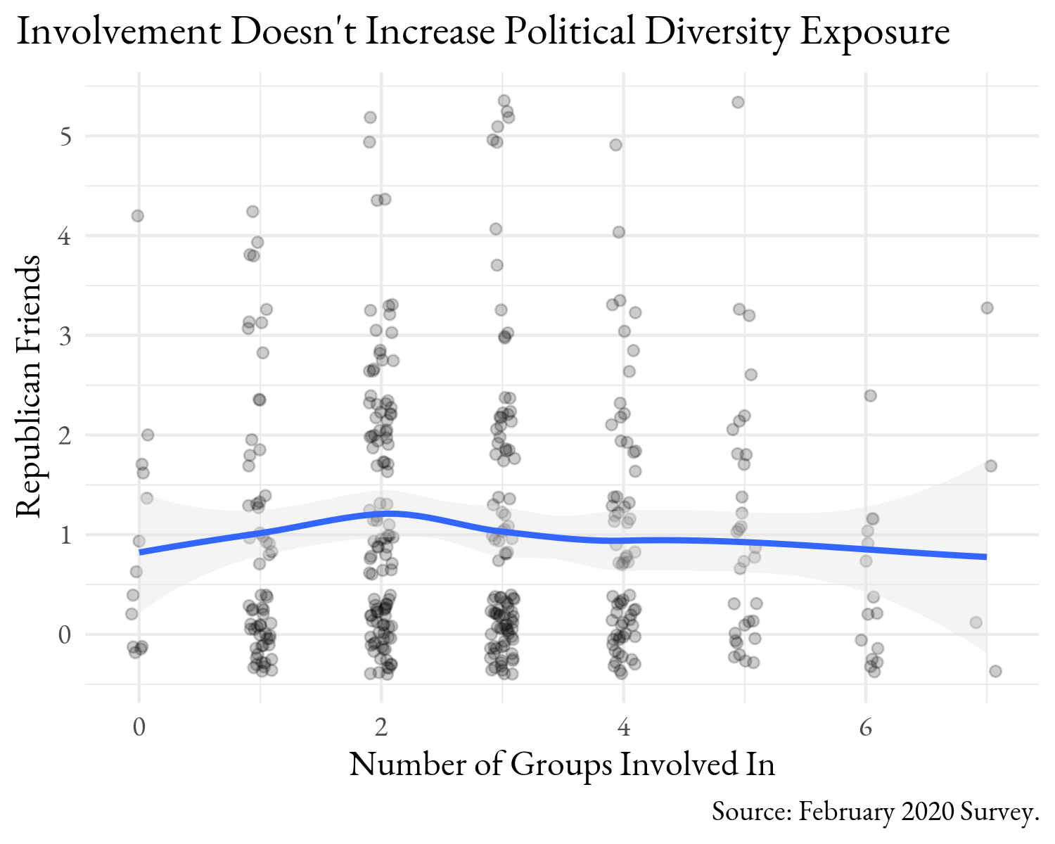 But the lessons of Greek life are not shared for other forms of involvement. In terms of group involvement and political diversity, the campus looks well mixed. Republicans are just as involved as Democrats when it comes to participating in clubs and other extracurriculars so diverse friendships follow. This conclusion aligns with the data – all partisan identities are involved in about 2.5-3 groups on average. The small faction of Independents are involved in a bit less, but not significantly so. Denison’s clubs and other organizations seem to exhibit bipartisanship, composed of individuals with different perspectives and political affiliations (which is good!).