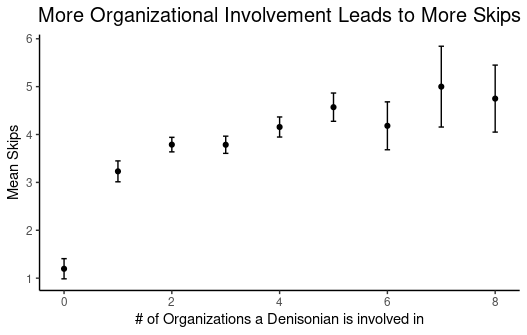 As students become more involved with organizations and keep piling them on, they report skipping a wider range of activities. Is it any wonder that those involved in more than 6 types of activities would also need to skip the widest range of activities in order to study? Fortunately, the average is a relatively sane 2.5 activities, which is linked to somewhat less skipping.