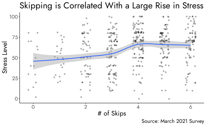 Those who skipped are clearly under more stress. Asked on a scale of 0 to 100, with 0 being “as chill as a cucumber” and 100 being “stressed to full capacity”, there is a clear and sudden rise in between the amount of things a student had skipped and an increase in their stress levels, where those who have never skipped report a stress level of 50 versus those who have skipped all 6 activities reporting stress levels of about 65, a 15 point increase. This makes a lot of sense, as students who are skipping activities to study/do homework are generally doing the work closer to deadlines since they have run out of time and are starting to feel the pressure of the clock.
